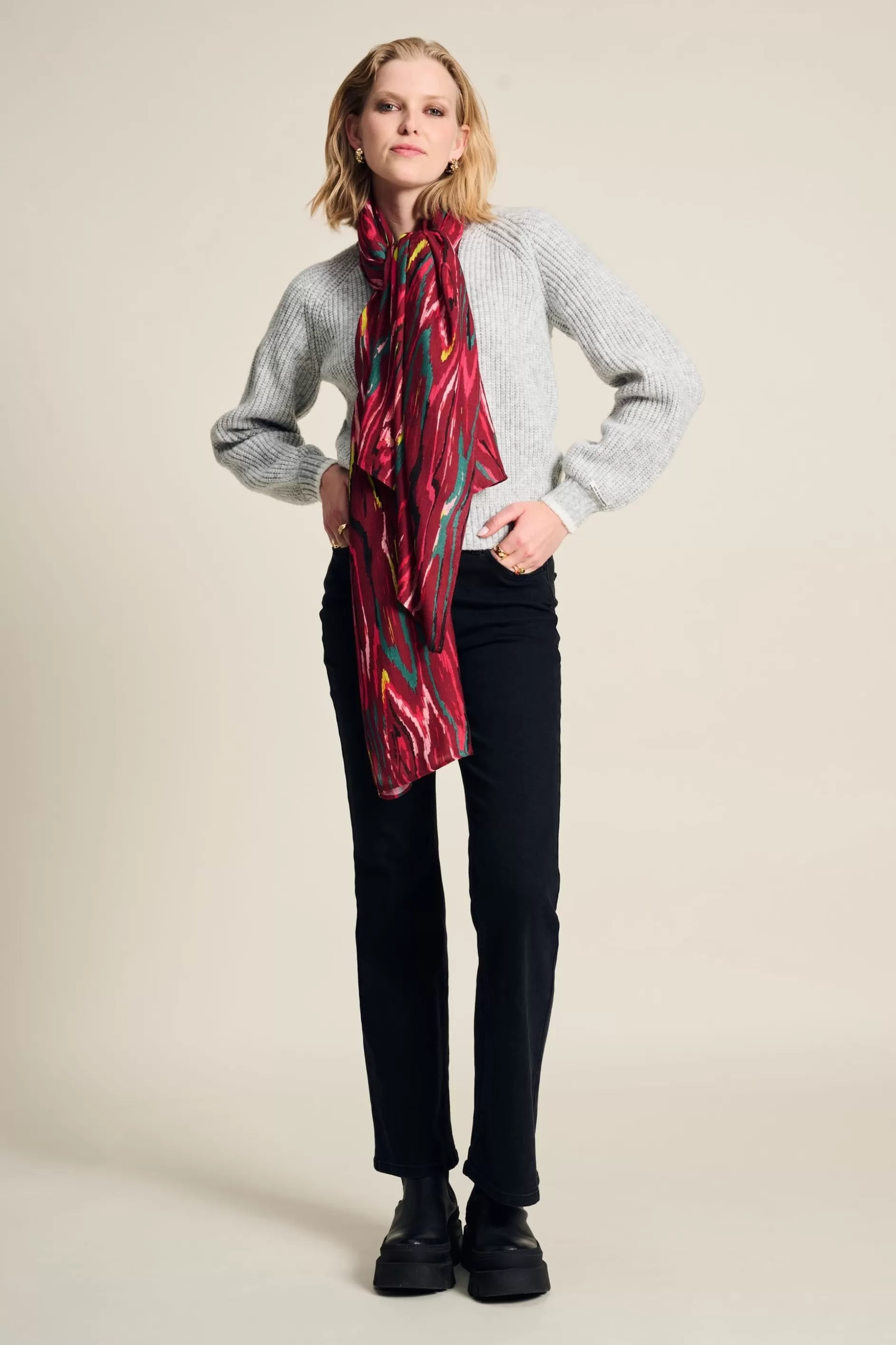 Ontdek deze rode sjaal met een prachtig houtpatroon, verfraaid met gele en roze accenten. De stof is more sustainable door de birla gecertificeerde modal.